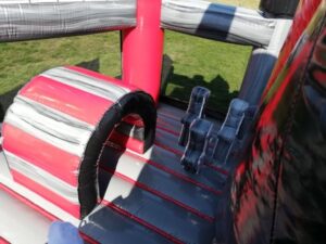Pas de souci, youpla-events propose un château gonflable multiplay comprenant une grande chenille centrale ainsi qu’un petit toboggan sur le coté.